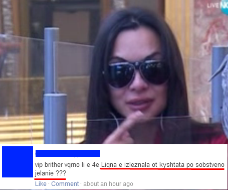 Най-вероятно в последствие обаче чалгаджийката си е дала сметка, че не думите на футболиста, а нейното собствено държание я изкарват лека и е решила да спаси остатъците от достойнството си като се махне от Къщата, коментират зрителите.